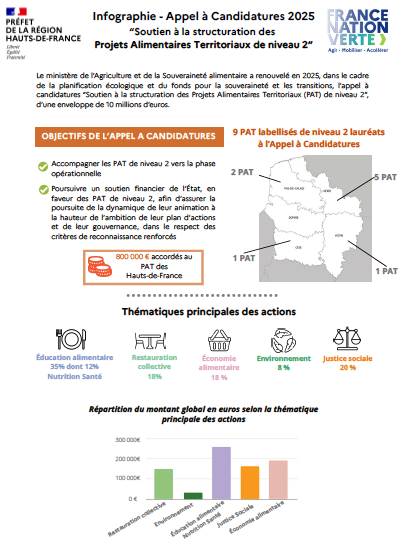 Géré par les directions régionales chargées de l’alimentation, de l’agriculture et de la forêt (DRAAF/DAAF), cet appel à candidatures vise à soutenir des actions concrètes pensées et concertées au sein des projets alimentaires territoriaux ayant acquis la reconnaissance officielle de niveau 2.